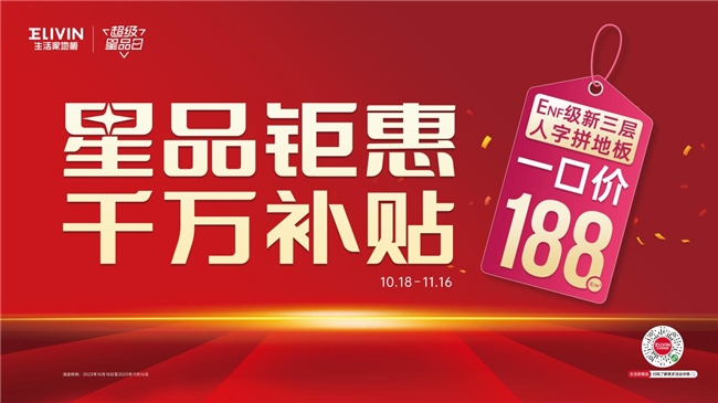 目前,生活家地板一年一度的超级星品日活动正在如火如荼开展中!今年的超级星品日,生活家地板精准踩中了装修人的核心诉求 —— 启动千万级补贴为消费者地板装修省预算!据了解,作为今年活动的主打「星」品——生活家ENF 级钻晶面新三层人字拼,在活动补贴后价格直降至 188 元 /㎡,相当于用传统的复合地板的预算即可拿下当下流行的拼花网红款。