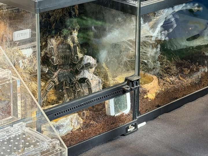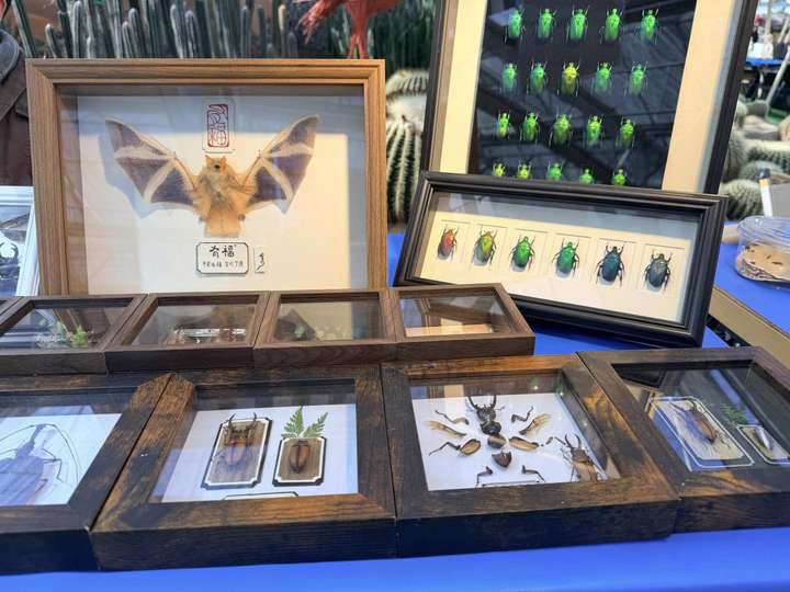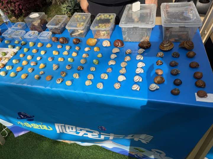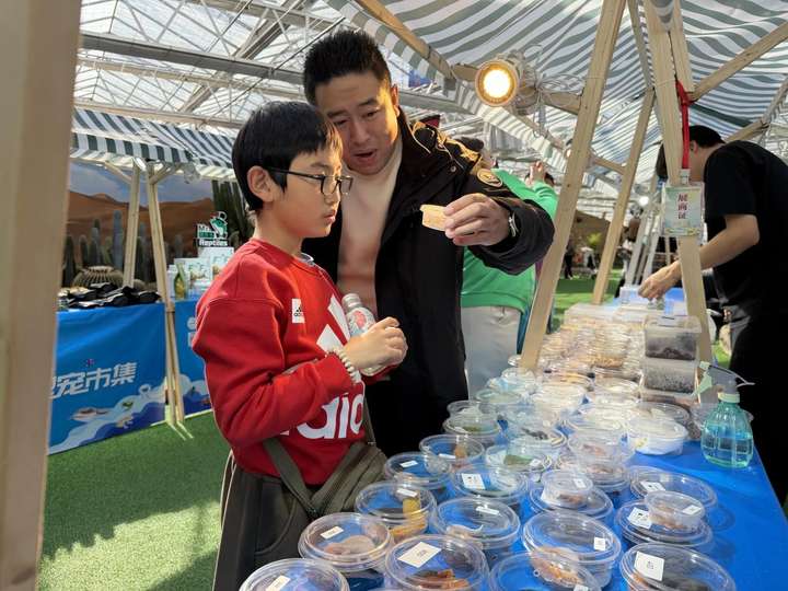 爬宠市集内人流不息,游客们在不同展箱前驻足,仔细观察着里面形态各异的“居民”。